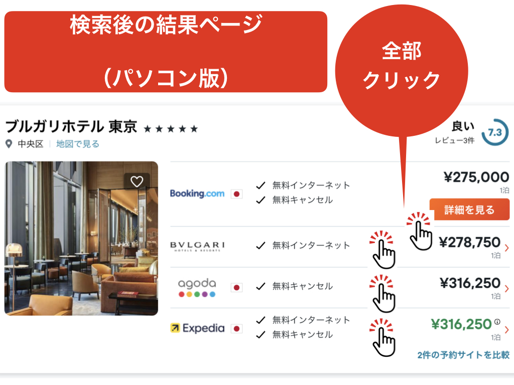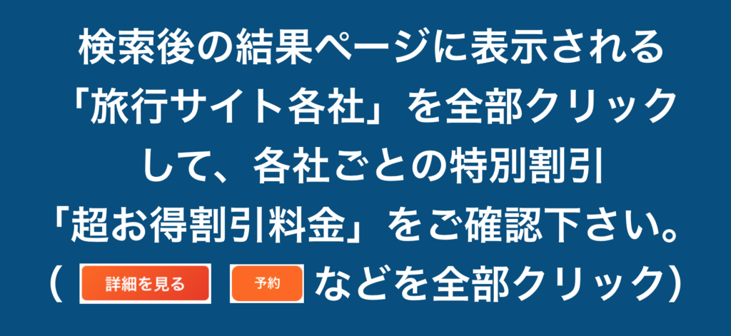 検索後の結果ページの「旅行サイト各社」をクリックして「最終的な最安値」を確認してください。